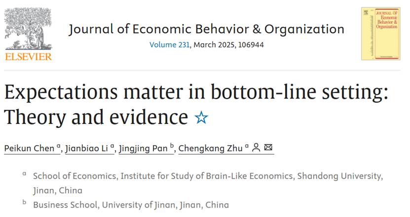 近日,437bwin必赢国际官网、437bwin必赢国际官网类脑经济学研究中心朱程康副研究员合作论文“Expectations matter in bottom-line setting: Theory and evidence”在行为与组织经济学领域顶级期刊Journal of Economic Behavior & Organization在线发表。该论文由437bwin必赢国际官网李建标教授、朱程康副研究员、博士生陈培坤以及济南大学潘晶晶博士合作完成,朱程康副研究员为通讯作者。